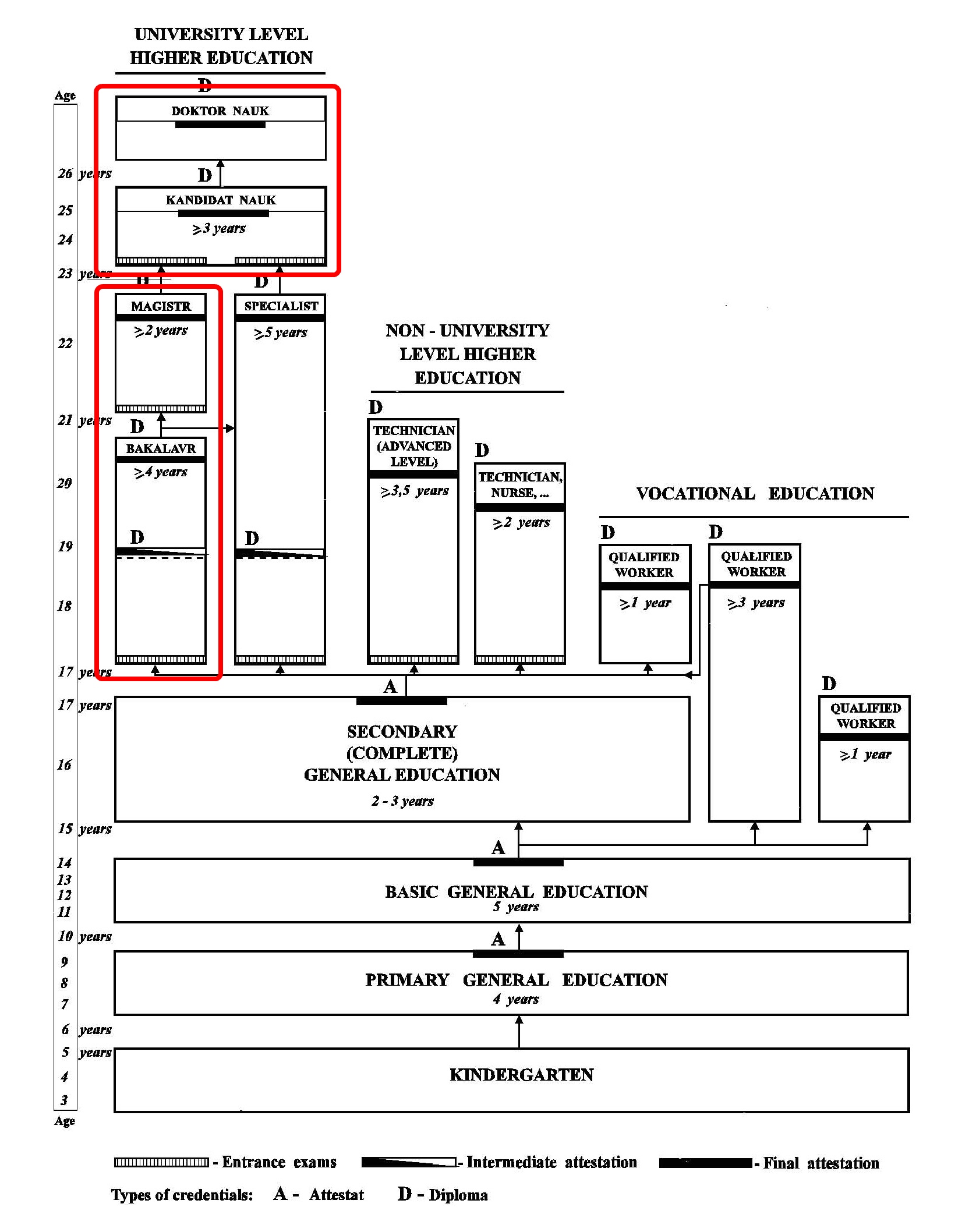 • Postgraduate higher education (6 years or more). After two years, students are entitled to receive a Magistr's degree. This is equivalent to a Master's Degree (M.Sc, M.A.) in the US or Western Europe. After a Master's degree, students can continue to study towards a doctoral degree: Kandidat Nauk degree (the first level, equivalent to Ph.D.) and Doktor Nauk degree (the second, highest level, equivalent to Professor)